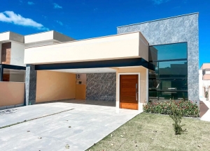 EXCELENTE CASA DE ALTO PADRÃO COM FINO ACABAMENTO, EM CONDOMÍNIO FECHADO COM SEGURANÇA 24H, COM  3 QUARTOS AMPLOS, INCLUINDO UMA SUÍTE MASTER COM EXCELENTE PADRÃO DE ACABAMENTO. OS OUTROS DOIS QUARTOS SÃO ATENDIDOS POR UM ELEGANTE BANHEIRO CANADENSE, GARANTINDO FUNCIONALIDADE E PRIVACIDADE. HÁ TAMBÉM UM LAVABO MODERNO PARA MAIOR CONFORTO DAS VISITAS.